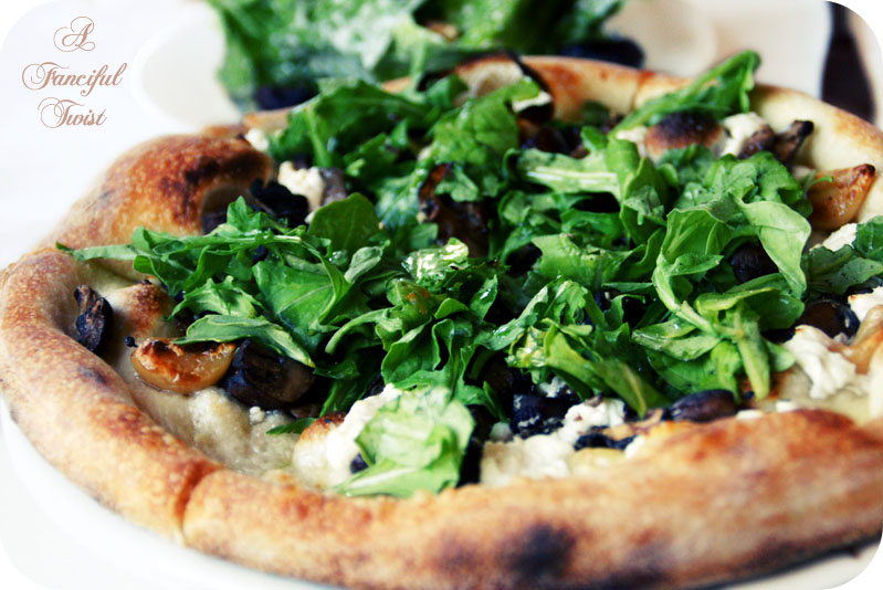 Thin and light but super flavorful. Arugula, goat cheese, sweet caramelized garlic, meaty & dark grilled mushrooms… More than enough for two.