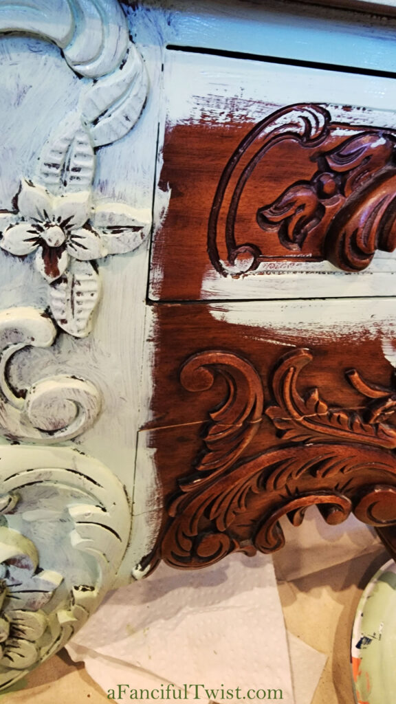 Before the painting began, the painter (that would be me, alchemist, painter, dreamer and hopeless lover of ridiculous fancy things) scrubbed the entire wooden piece with a towel saturated with rubbing alcohol.