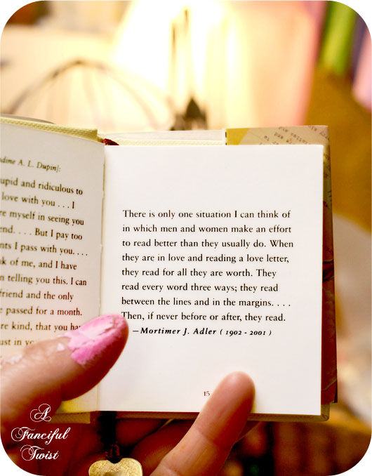 I am getting worse about reading details. But when I read this, the memory of pouring over love notes, reading into every letter, made me nostalgic for dramatic love letters (I still have all mine from beaus, even elementary school ones). I am ever thankful for this wee book sent to me amongst many other treasures, from beloved Miss Deborah…