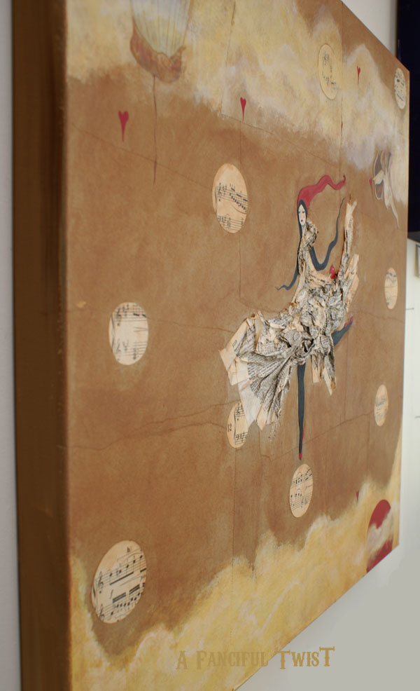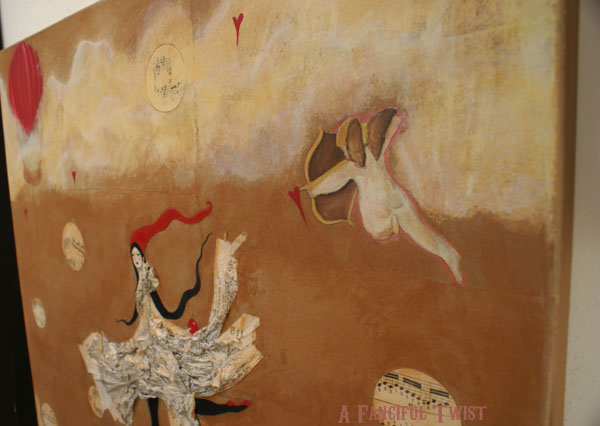 I had fun drawing this girl. She has alot of movement in her… I also had cupid swirling in my mind. What I do is draw the pieces on parchment card stock, with pencil. I then cut them out and decoupage them to the canvas. Like a paper doll of sorts…