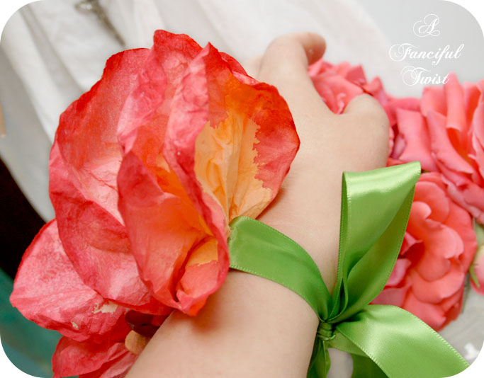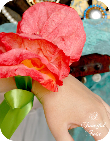 i love your corsages…. My son freaked out he thought when i said i was making corsages his prom date would have to wear a coffer filter one lol.. Yours are beautiful enough. My grandam use to make paper flowers,this reminds me of her. I started one and ran out of ribbons