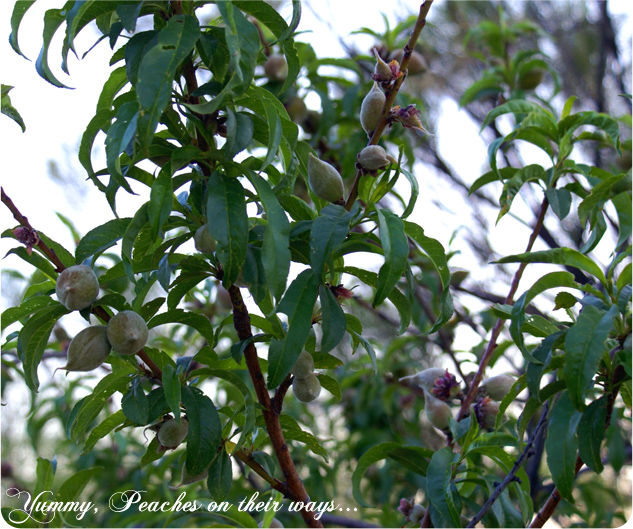 Oh, I almost forgot to tell you about my half a heart attack!  Yesterday, Mr. Lovee held out his arm so I could hobble out for a tiny walk.  I wanted to see the peaches in their very early stage…