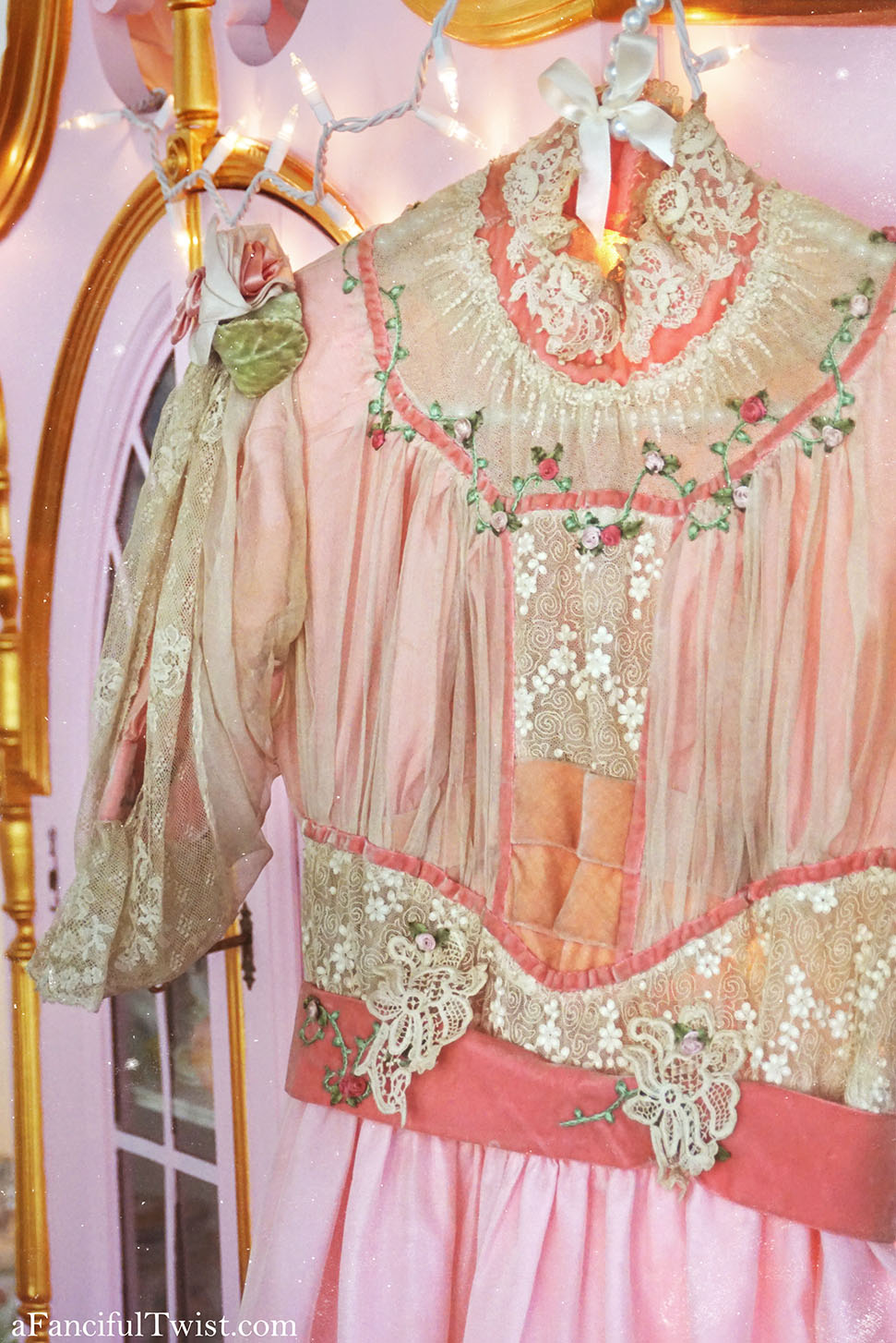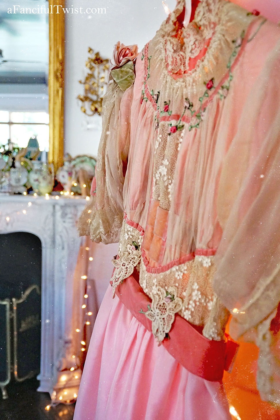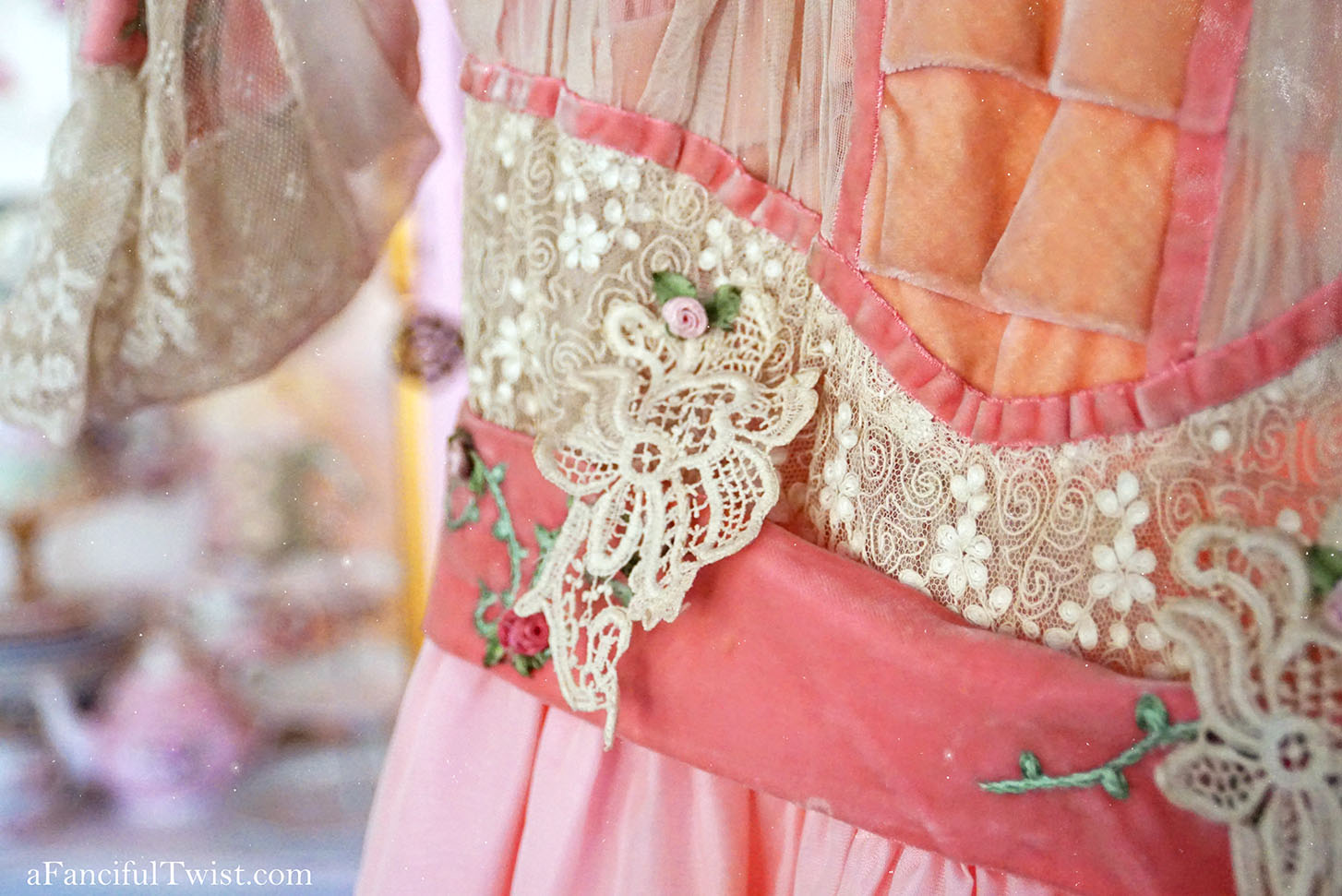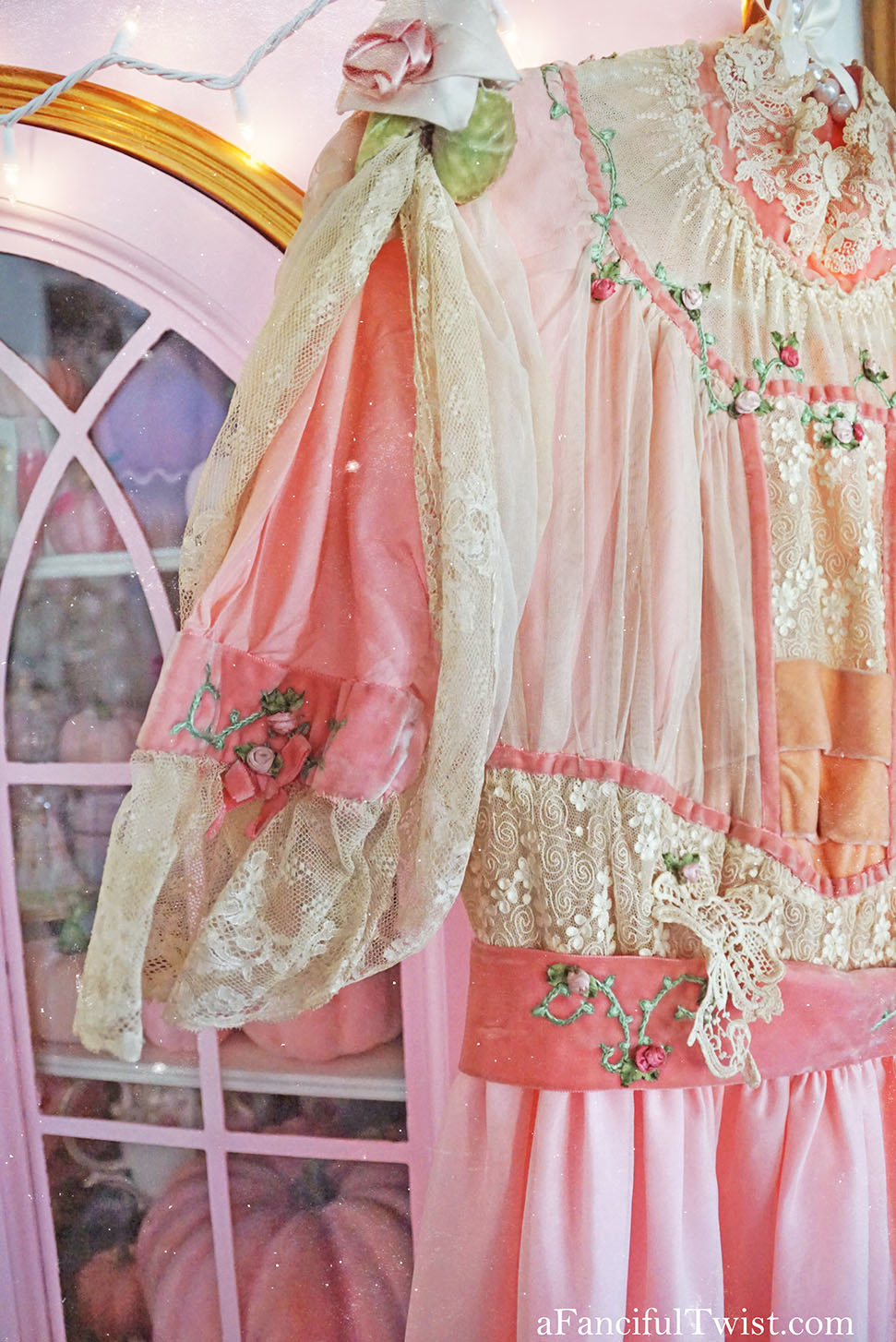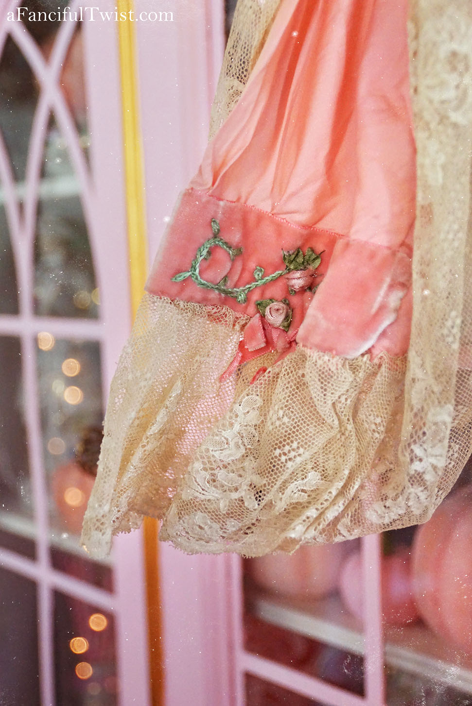 Into a time of delicate lace, embroidered flowers and pink velvet trim.