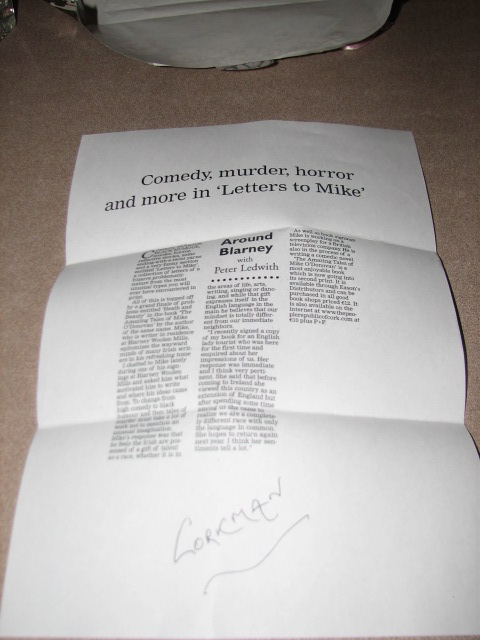 Happy Birthday to Mr. Ireland. We had a lovely tiny party last night. The food was scrumptious. Jasper’s of course. I mean, Saguaro shaped corn bread?? Love It! And the dessert they gifted my guest was unbelievable. Thank You Jasper’s! Oh and talk about serendipity. Mr. Ireland, who has asked not to be blogged about, is from County Cork. He has only lived in the states about 5 years. Well, he misses his home often. So, I was at the Golden Goose. Best thrift store ever! And found this book…Guess what? I didn’t even know this until last night…It was signed by the author and had some internet papers in it that talked about the book’s ties to Cork. Someone had even written the word "Corkman." Was that perfection??? Wild I’d say….See you soon!!!