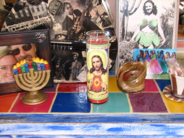 I hope you are not annoyed at my tale. I think religion is such a tender subject. Let me tell you how I am. Mr. Lovee is my favorite in the planet. We share seperate beliefs, he is Jewish, and we respect eachother completely. I have friends who are no religion, and Mr. Lovee actually embraces "Nature" more than any religion. (When I took the picture below at Mr. Lovee's, I said, "Wow, look this is a perfect example of our lives." From our beliefs, to the desert, to Spanish furniture that I tweaked with paint, to the guitar I decoupaged for Mr. Lovee's birthday our first year we met. The guitar contains images that make up his world, being a Blues Upright Bassist and all…)