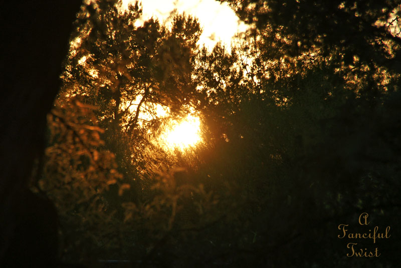 Golden sunset through trees included.