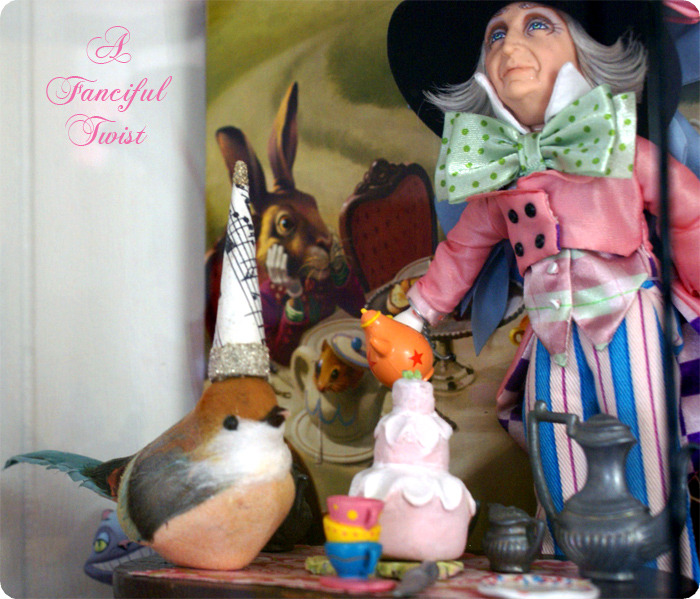 Then I remembered I had the Alice in Wonderland Barbie in a box, and they would certainly fit her! (Alice was a gift from Mombie when she gifted me the Mad Hatter that looks like Tom Petty).   Remember him?  I stuck him in a diorama…  I know they are both kinda strange…  But, I like them all the same…