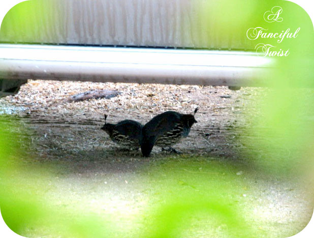 Joey tells me things about the other birds. The quail drive him insane. He thinks they are rather selfish and full of themselves ;) He tried to talk to a quail baby, you know make friends, but mama quail ushered the babes to hide, and then skipped along, snooty as can be, hurried as a bee…