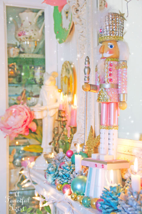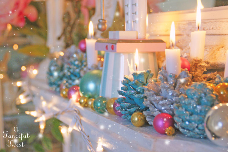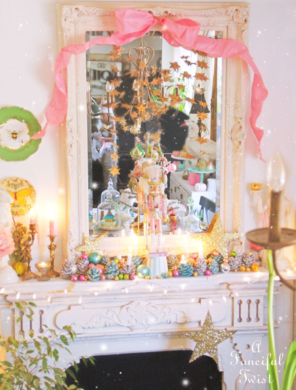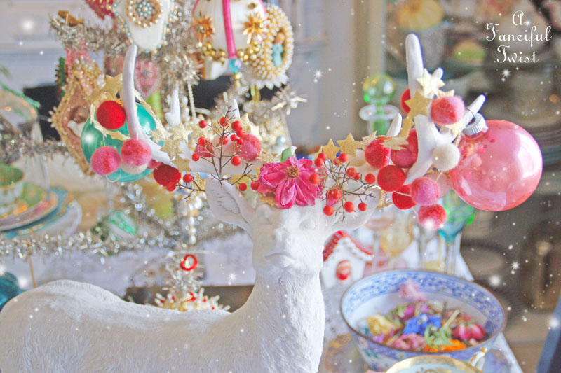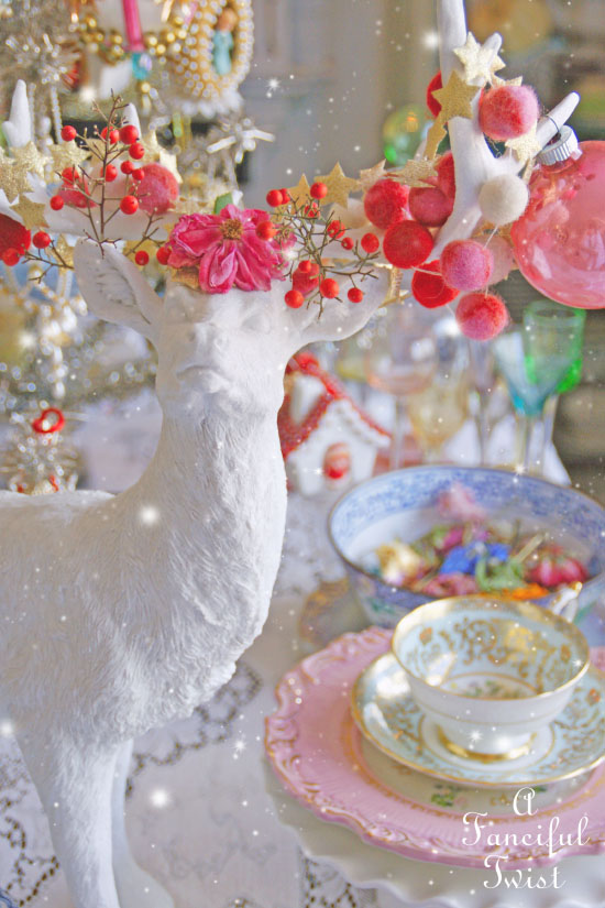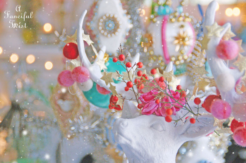 Have I ever told you about my Gma? Gee-maw. My dad’s mom. She was awesome. EVERY outfit had its own purse and shoes. And jewelry. AND WIG. I kid you not. She had giant walk in closets before they were cool – and one whole room that was nothing but wigs. She very much looked like Dolly Parton. And never did anything halfway. And had some serious energy! You remind me of her <3 Anyway. Gma would have absolutely SWOONED upon SWOON over your mantle and that deer. I mean like, worse than I am. She had Christmas trees for every room and they matched the décor - she had a formal livingroom that was black and gold velvet and silk (somehow she made it not look too pretentious) and she would go all out with a black flocked tree (I kid you not and gold ornaments with splashes of deep emerald greens and I know it sounds odd but it was jaw dropping gawjus). And she had a peacock room - blues and turquoises and silvers..... and she had a cotton candy room -- and ohmigosh you kicked up her cotton candy room about a trillion notches. This is the epitome of dreamy. I agree with Deezie -- magical!! Now I gotta do more 'cause I am inspired all over again 🙂