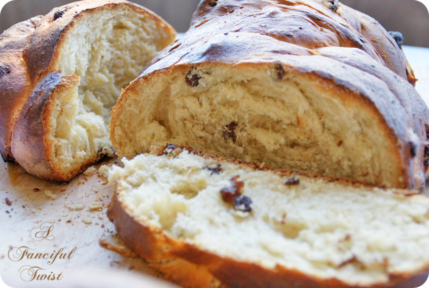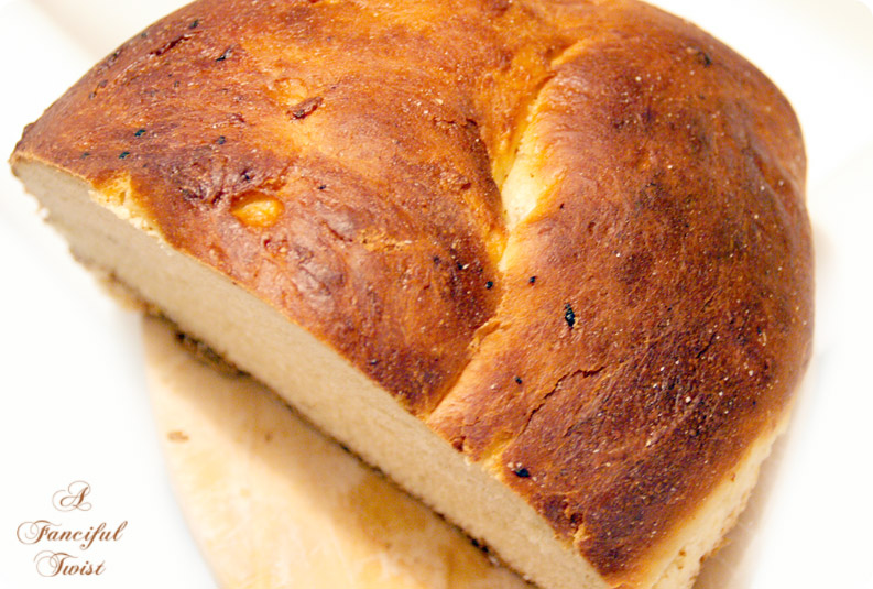 The difference between this bread and the bread I showed you last week (besides the raisins which you have to soak, etc), was that this one called for two extra eggs, oil and honey and was much stickier and needed a whole lot of flour during kneading (more than suggested by the recipe).