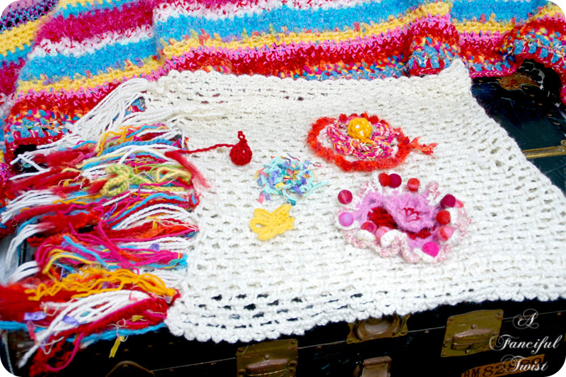 Then the fun part begins, attaching my wonky lil' crochet flower things…