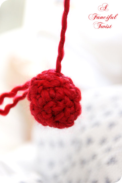 I wanted some big puff balls, so I crocheted the equivalent of a tiny hat and then stuffed a huge cotton balls inside of it, and sealed the top. One of those is the yellow center you see above, and I made a red one too. I think I need to make more more more 😉