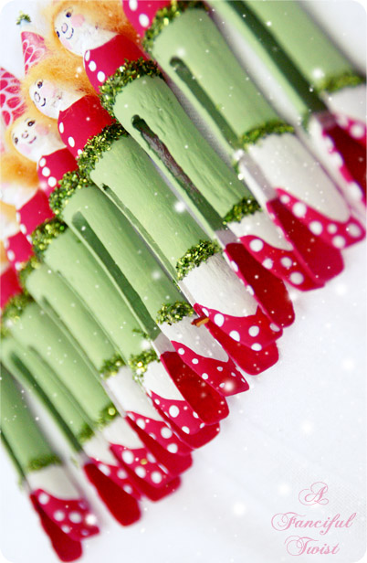 Aaah eeee woooo! Those are just soooo cute! I don’t know what it is about them….perhaps their dotted shoe-sies or their sweet lil’ faces…eeeee!! V. you always make the cutest of cute things. I may have to see if I can sneak some clothespins out of my dad’s workshop..he’ll never notice..hee hee hee…although he may notice if they’ve been instantly cute-ified in all their elf-y glory…hehe!! <33