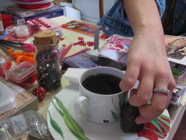 Isn't that fun stuff she brought to share. Oh, look at that amazing bag she made on the bottom right of the pic just above. She is an amazing clothing + handbag creator. I fed her some of that lovely puffed honeycomb stuff I rave about…and a cup of lovely coffee.