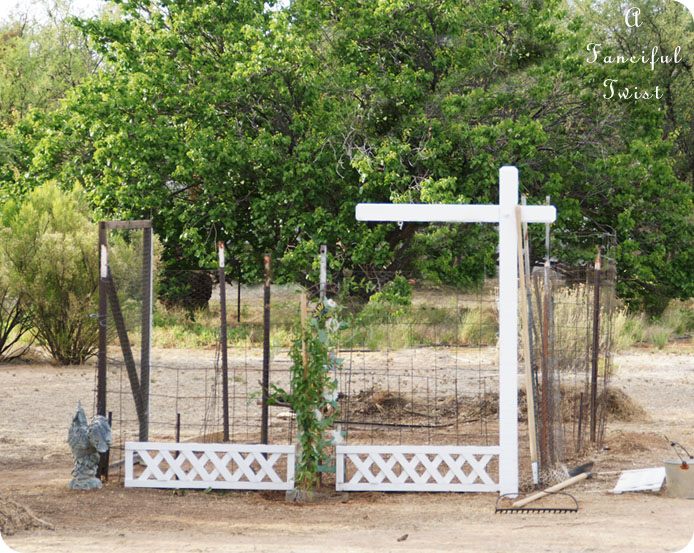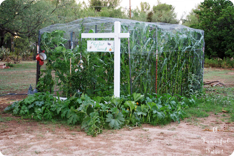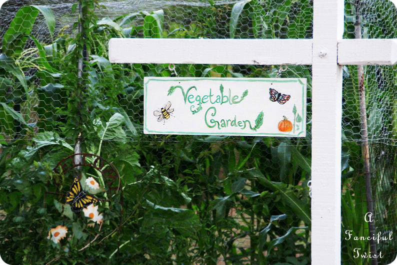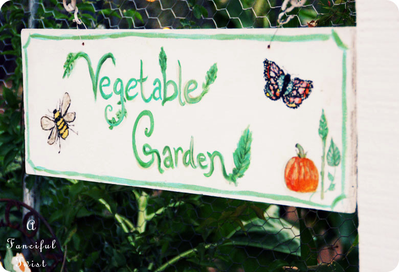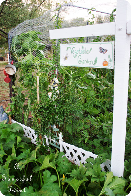 I planted a vine in front, and painted a sign post white, for a vegetable garden sign I was painting. Then Mister put the sign post in the ground for me.