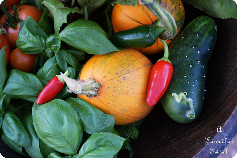 The pumpkins, tomatoes, fresno chilies, jalapenos, and cucumbers in this photo above (oh and some of the basil), are growing in a vegetable garden in the front yard, under a big huge mesquite tree, where my swing hangs.