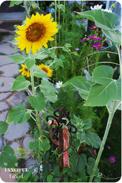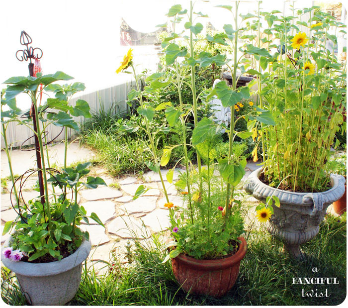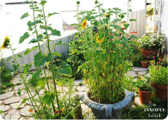 The good thing is that, all of the sunflowers below have already bloomed, and I got to put them in vases.  There are giant sunflowers still around the garden (in ground).  But these small to mid sized sunflowers worked great in vases.  And, now that they are gone, the cosmos, calendula, bachelor's buttons, and hearts n'flowers that were also growing in the pots, are doing great…