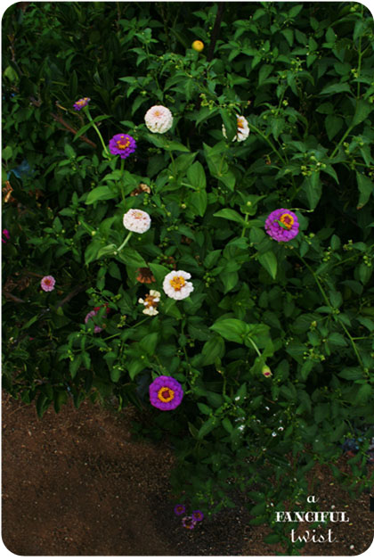 Oh you garden makes me miss my old FL sun garden….I’ve planted zinnias in our wee cunny spot out front this season….but alas the weather that is ever so good for moss and misty mornings and raining days is not too nice for tomatoes and sinnias…they are, all of them, quite soggy, indeed. I should just embrace the fog and only plant shade loving dainties, no? tee hee