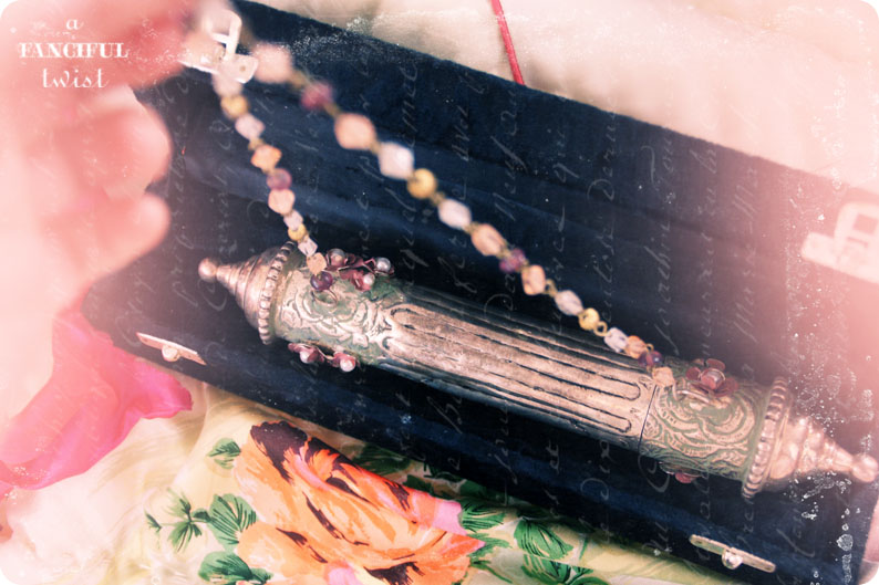 Sorry Beloved Fanciful friendling, but I became caught up in what the “D” might be. So back to that beautiful little cylindrical what-not with the dangling gems. Me thinks my breath was caught away at its beauty when the picture scrolled down. It reminds me very much of a Mezustha…you know the word I’m trying to spell??? The lovely little jewel that the Jewish people place next to the lintel and door posts of their homes…I love those and all they represent.