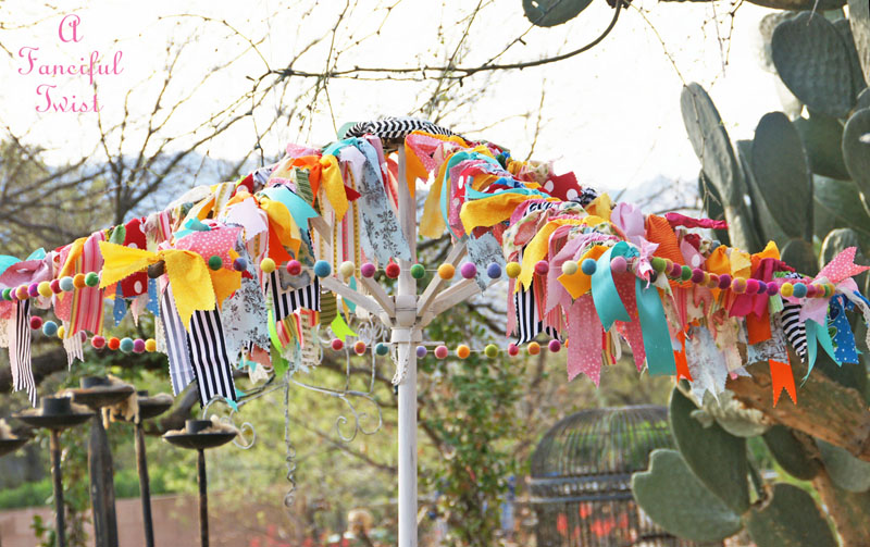 So, I took stacks of scrap fabric and ribbons and tied them on to each naked umbrella arm.