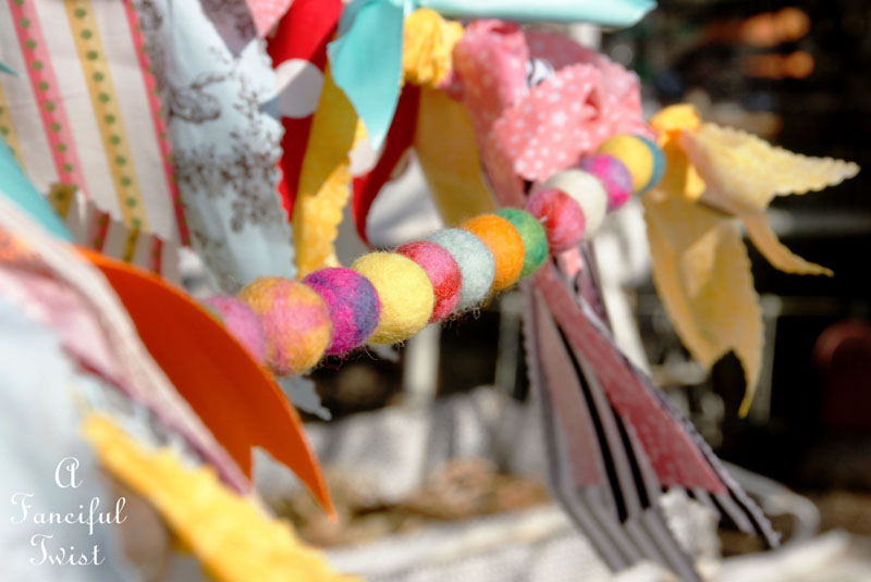 I also love felt balls! I have a couple of little garlands on the headboard of my bed. They have different sized felt balls as well as some felt flowers. I haven’t learned how to felt, so all of the felted items are purchased! They are strung on some colorful “fuzzy” yarn with spaces in between which show the different colors of the yarn.