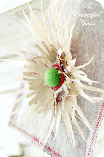 Once my bag was sewn and ready to be decorated, I made 3 paper flowers to embellish my bag with. I used some other fused plastic I had made, a brown paper bag scrap and a used coffee stained coffee filter (which I rinse, save and dry after we make coffee) to make the flowers.