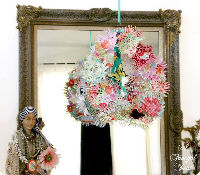 To make similar paper flowers (or snowflakes), feel free to use the paper flower tutorial I shared with you earlier in the year, right here.