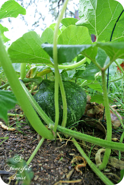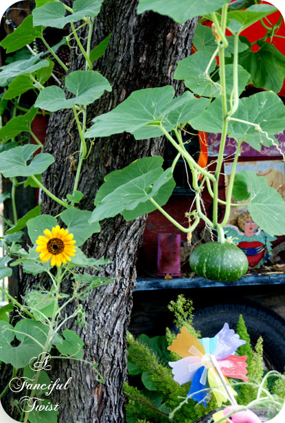 These pumpkin vines have been sooooo much fun to watch. They have put on quite a show, climbing trees and growing on birdcages even…