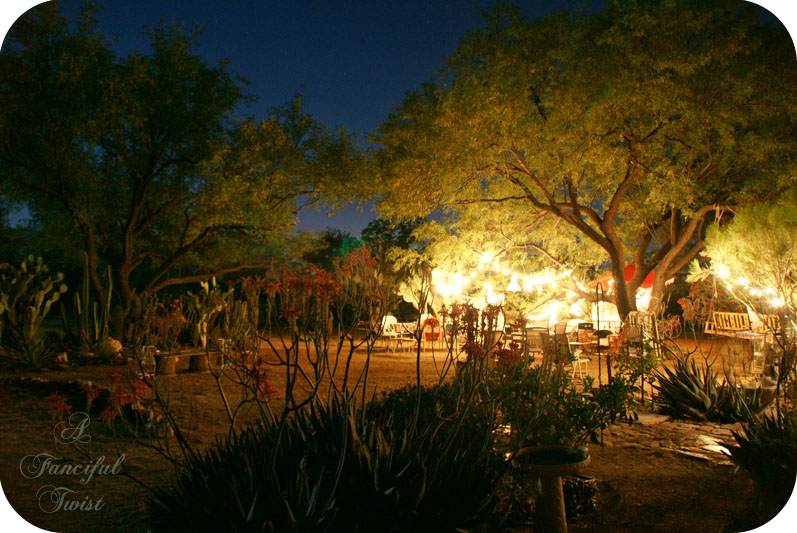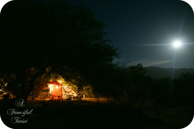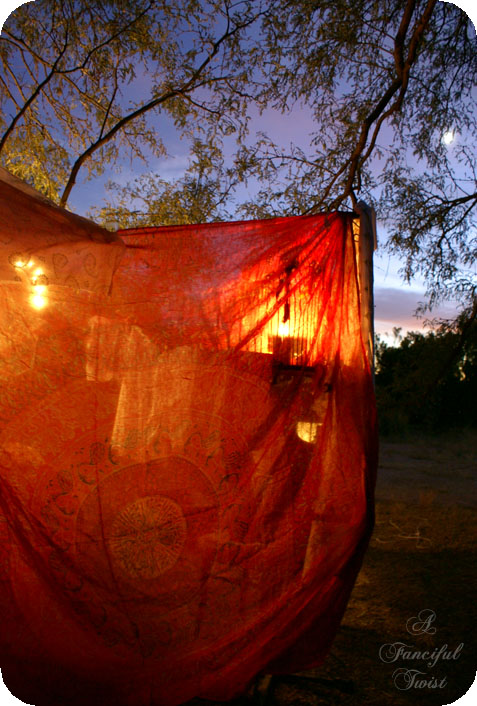 October 2008 marks the date that I created our outdoor gypsy-ish living space,details in this blog post here with lots of photos. We almost never get rain, so it seemed a perfect idea, and we loved it so much we decided to keep it alive all the time…