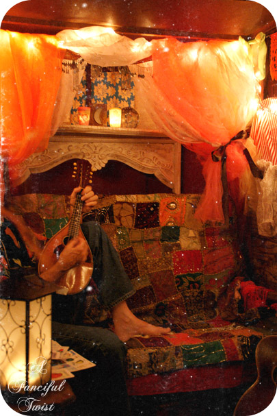 One night, I decided to just decorate the inside of the wagon with whatever I had. You can read that post right here. Mister joined me and played some tunes, and before you knew it, just 20 steps from the gypsy garden, we could sit in an enclosed gypsy wagon and have a blast…