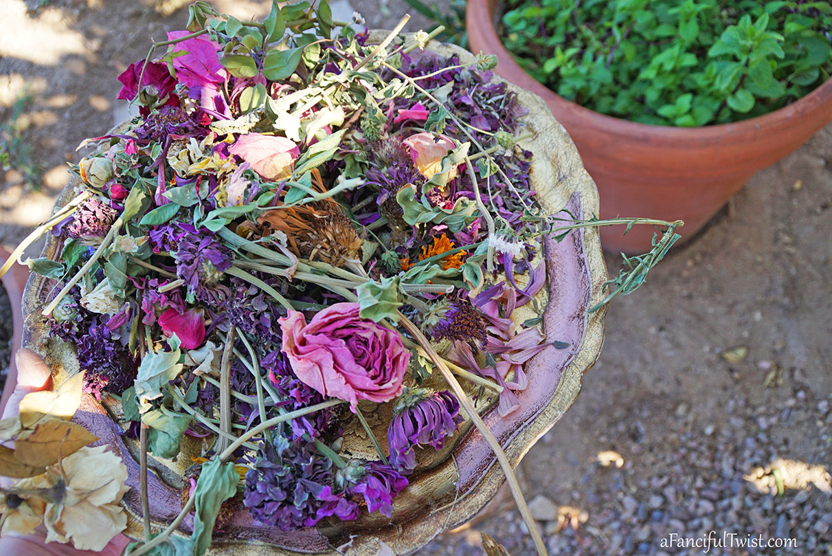 There might be a random dried rose in there too, but I crumble them up and let them become part of the soil.