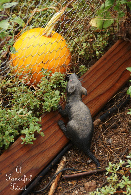 Our fake plastic rat hangs out, trying to scare off critters.
