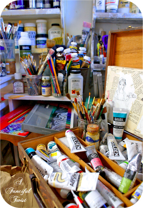 Wow !! Love to peek on your studio …full of paints and brushes.