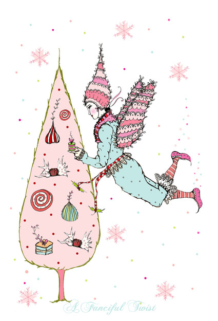 I can't wait to share, so I will simply jump in now!  Sugar Plum Fairies and Candy Swirled cakes, red and white polka dotted tights and girls with pet deer…  Snowflakes abound, and happy sparkly yummy winter cheer!!  My drawing pencil sends early greetings!!  (but not too early for card shopping)