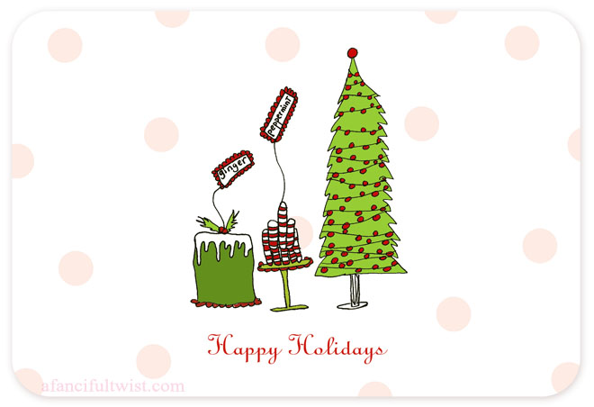 Last year my Christmas cards were your Holiday Tea Party cards – I loved loved loved them and so did the recipients. In fact, one of my best friends, I noticed, still has it on her refrigerator as of a couple weeks ago. I think she must like it too. 🙂