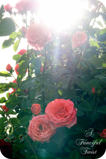 Sometimes, I wander around my garden and feel like, I am getting to enjoy some of the hard work of the little old lady that lived her about 20 years ago (although Mister did a ton, and added a corridor of trees and shrubs years ago). She planted the coral, blood red and pink frosting roses. Mister Lovee said she was mean and rotten, and made everyone miserable on our sleepy street.