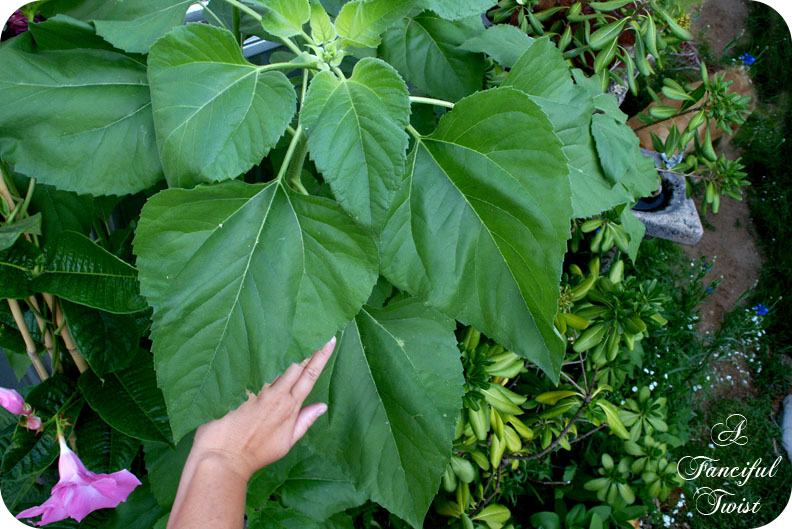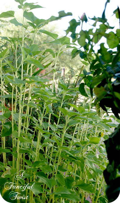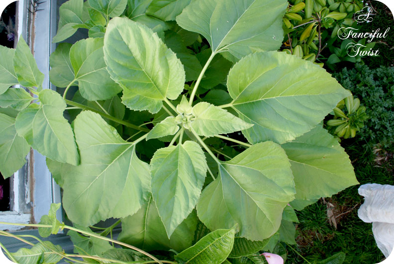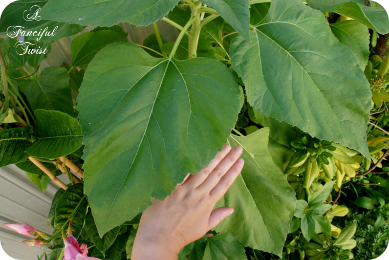 Huge growing red velvet sunflowers. You can tell they will be red velvet from the dark veins…