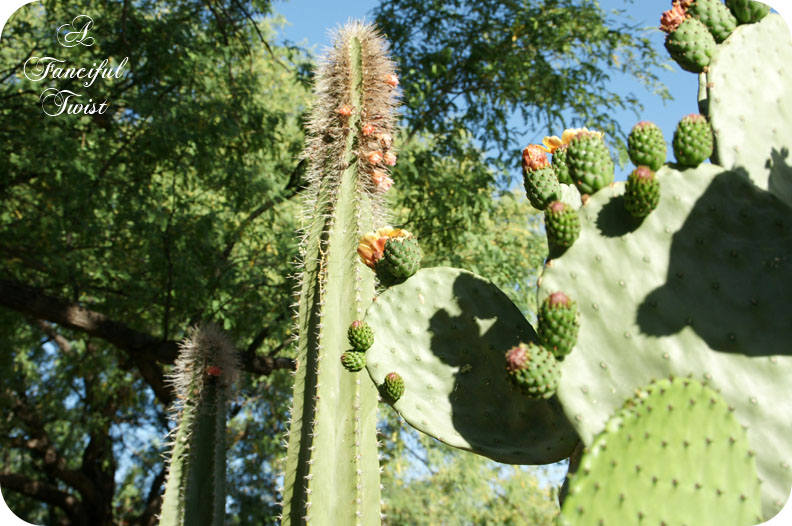 I love the unexpected glimpses of your colorful roses with the stark and heavy structure of the cacti in the background.