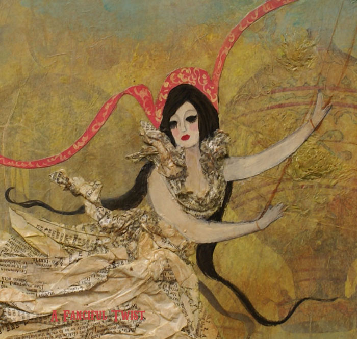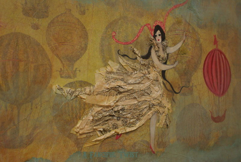 Up close & in person, you can see her thin delicate long eyelashes. I am finding such an intense amount of joy in creating these paper dresses. This painting surprised me today. I stood it in the wondow sill and walked away. When I went back for it, it was glowing. The light entering the back of the painting created a bit of a stained glass effect. It was amazing, the hot air balloons were so vivid, they almost looked like they were moving… A treat for whoever this piece goes to live with…