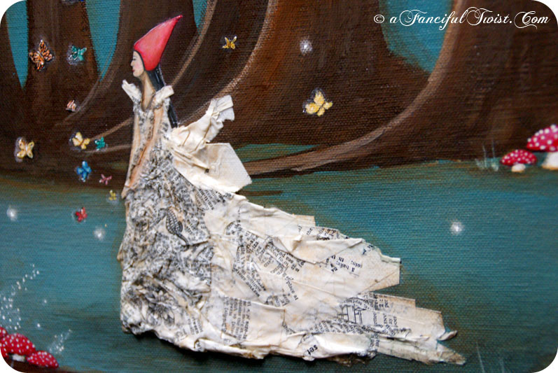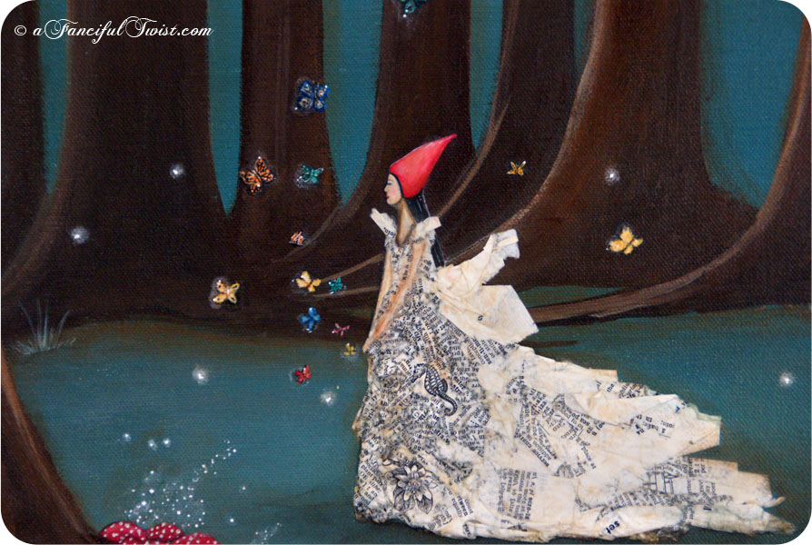Love love love the painting, it has just the right touch of whimsy to it, I just want to know her story, what led her to this moment wondering the woods in her word paper dress…