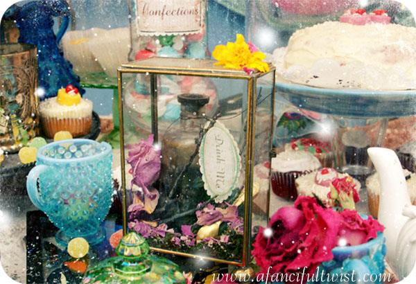i am actually having a wonderland birthday party….and my house is decorated with terrariums…and large dragonflies…glittered pears…and lots of candy…that is my wonderland…