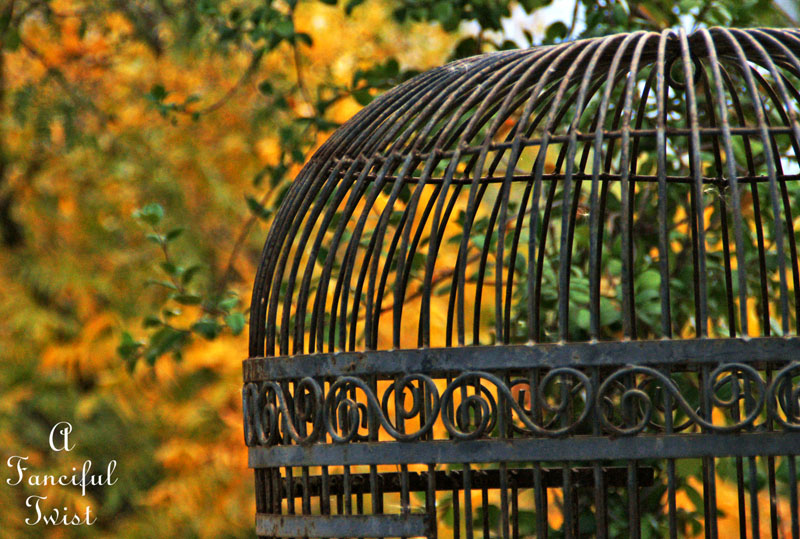 Love the photo about three-quarters of the way down with the birdcage in the foreground and the yellow leaves in the background – the contrasts are striking!