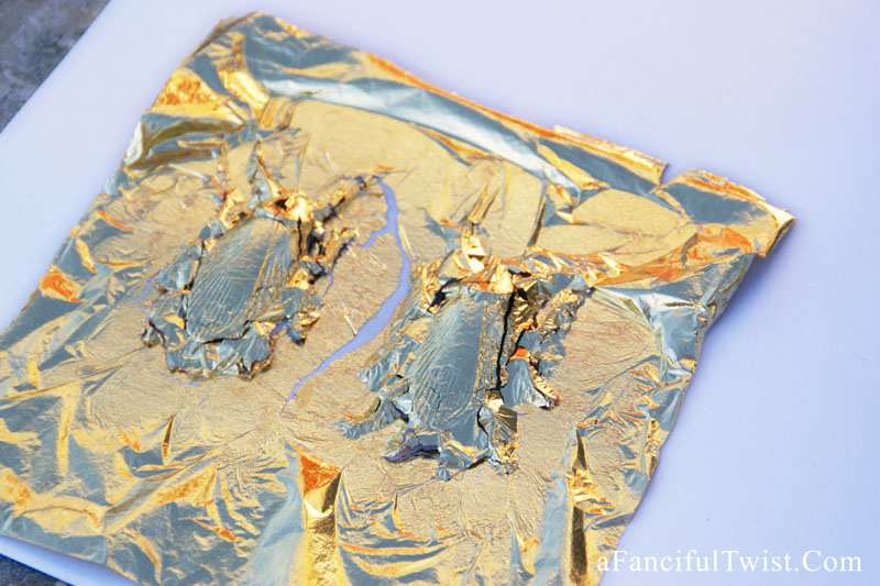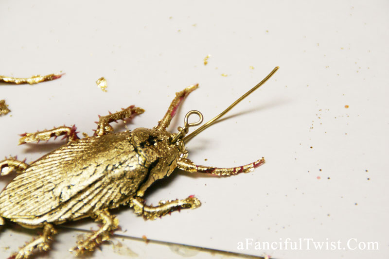 I just spray painted a little clear spray paint onto my plastic cockroaches, and gently pressed the gold leaf down. Then I put them aside to dry while I worked on the other bugs. (gold leaf both sides)