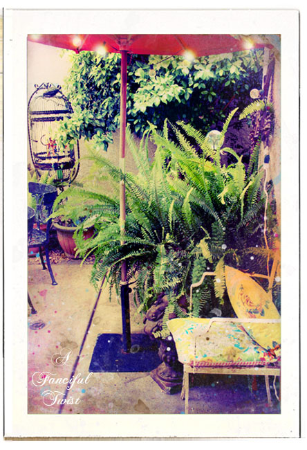 My courtyard at the city house is full of beloved green growing creatures. The ferns above, were given to me in tiny little plastic containers. Tiny 99 cent ferns. 3 of them. I planted them, and they took off. Aren't they happy ferns?
