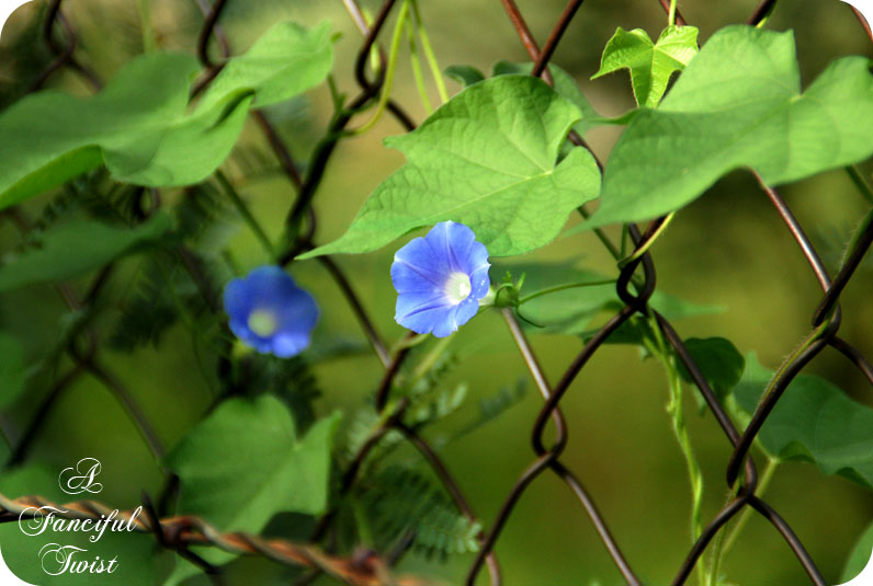 Morning gloriousness vine is triumphing over chain link hardness…..