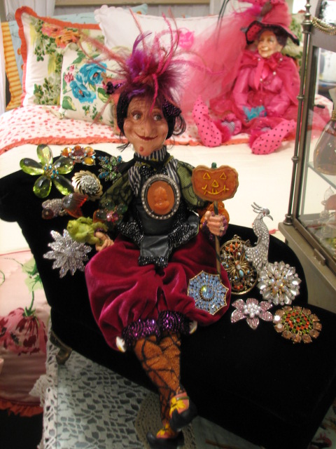 I’m losing my mind over the witch on the black chaise lounge….you have the best stuff! But then as a witch I bet you just sit in the enchanted chair, don your hat and striped socks and twitch your nose. Hmmm, perhaps I need to send you a “twitch” list! Kind of like Santa! HA!