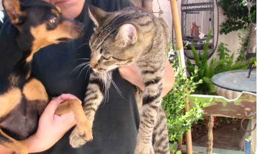 He has the longest tail I have ever seen on a cat. Now the second strange thing is… Larry likes dogs. That helps because Kristen has a miniature Pincher. Larry walks up to Douglas and kisses him on the nose…