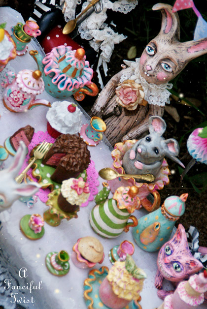 Oh Vanessa!!! I am so madly in love with this enchanting set of characters and wee cakes. I should like to purchase the entire set for One Million Dollars!!! As soon as I win the lottery. I cannot think of one thing that I would want more. Seriously. When the world gets too real, I would just sit in the shade of a low growing weeping willow and play tea party, and all would be well in my soul.
