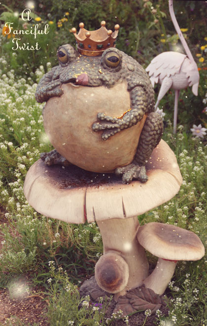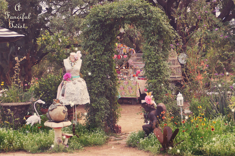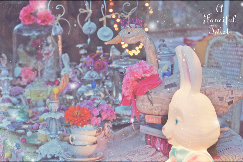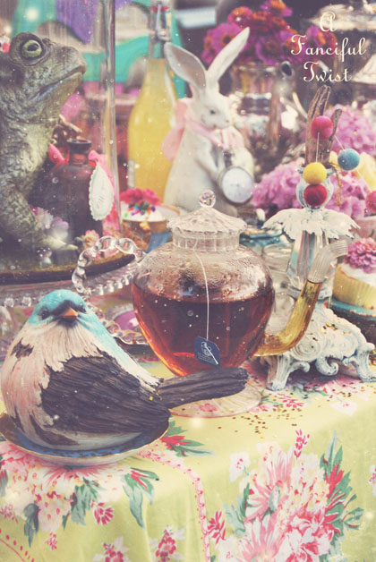 I could tarry all day and into the night in this magical world of fairyland! Certainly wish I had know about this party. Hopped over from Art and Sand. I have the most wonderful purple mad hatter hat that would be so fun for your mad tea party. Wondering how long the party stays up and if I would have time to do a post the first of the week? I love the teacup arbor and all of your little garden creatures. So much eye candy in each and every photo. Glitter just makes the world a happy place and I certainly found that here. . .fabulous!