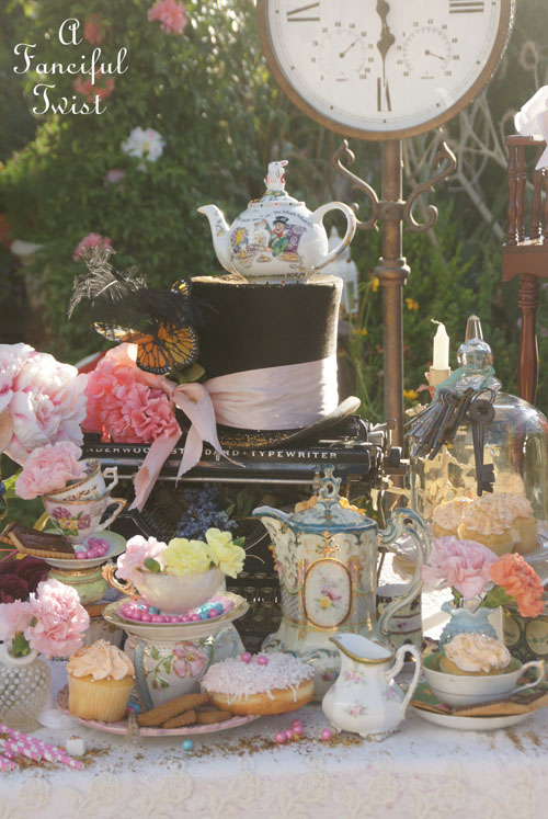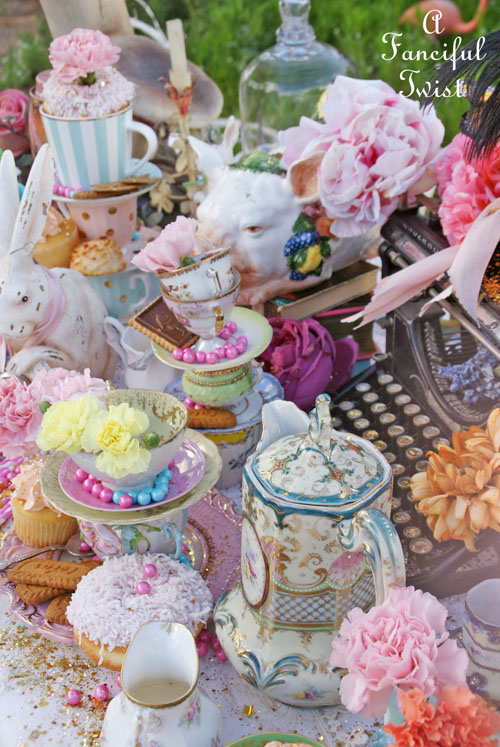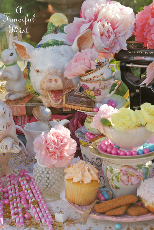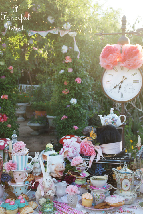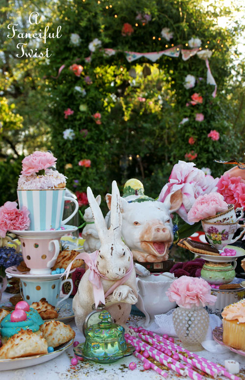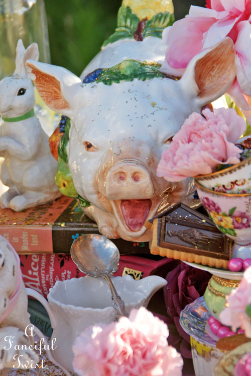 Oh my such magical fun! This is my first year joining your fabulous tea and imaginary fun is so special to me!! 🙂 I had so much fun pretending I was mad and playing in the garden! Your tea is absolutely fabulous and I can’t stop looking at each and every picture. I see more whimsy in each and every glance. The pig, the clocks, the rabbits, the teacups, I could go on and on. Love the sugar shapes and I can’t wait to try making some. Thanks so much for this delightful party! Can’t wait to come back tonight and delve into a wonderland of posts!